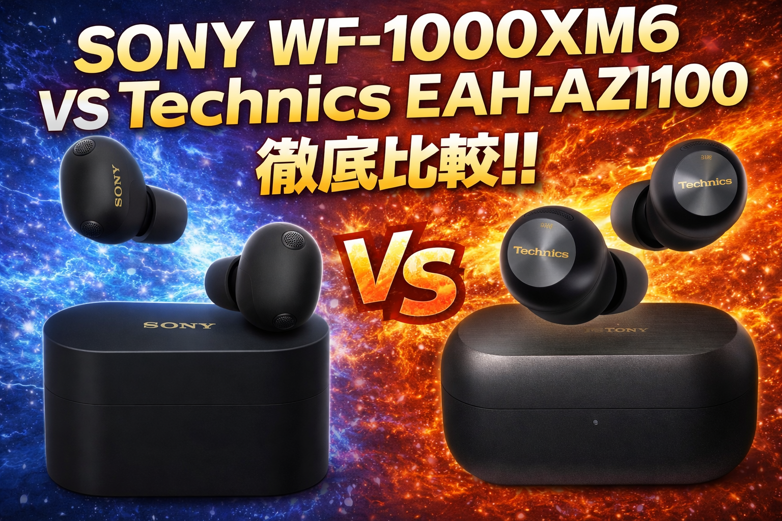 この記事では、SONY WF-1000XM6とTechnics EAH-AZ100を、基本性能、音質、ノイズキャンセリング、通話、装着感、バッテリー、機能性、向いている人という順番で整理し、表を多めに使いながら直感的に読みやすく比較していきます。