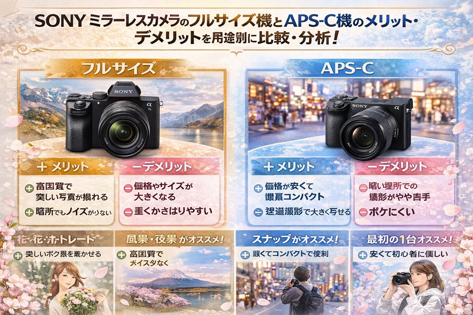 SONYのミラーレスカメラにおいて、フルサイズ機とAPS-C機は単純な優劣では語れません。フルサイズ機は画質の余裕、暗所性能、ボケ表現、仕事道具としての信頼性で強く、APS-C機は軽さ、価格、望遠との相性、日常での扱いやすさで非常に魅力的です。