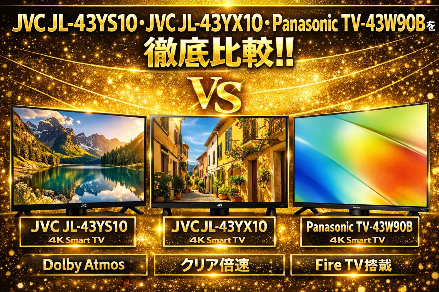 JL-43YS10は価格を最優先したスタンダード機、JL-43YX10は画質・音質・ゲーム性能まで強化したJVC上位機、TV-43W90Bはさらに価格は上がるものの、高画質エンジン、倍速系の滑らかさ、30W音声、3チューナー、4HDMI、2画面表示、転倒防止スタンドまで備えたハイグレード寄りの43型です。