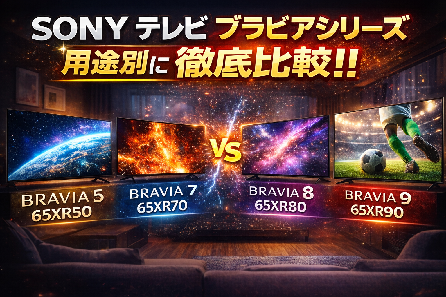 今回比較するのは、65V型の現行BRAVIA 5(K-65XR50)、BRAVIA 7(K-65XR70)、BRAVIA 8(K-65XR80)、BRAVIA 9(K-65XR90)の4機種です。どれも高画質モデルとして魅力がありますが、実際には狙っているユーザーがかなり違います。単純に「上位機が一番良い」と考えると、選び方を間違えやすいシリーズです。
